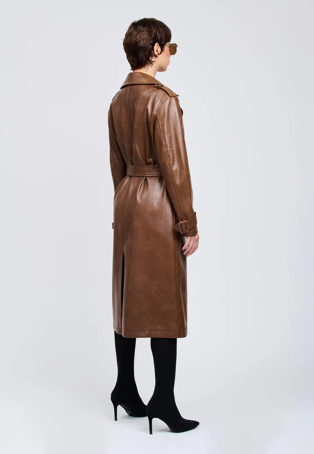 Questo lungo trench in morbida finta pelle ha un look aderente grazie alla cintura in vita e alla chiusura a doppio petto. Le spalle e i polsini con linguette, le due tasche e lo spacco sul retro strutturano questo capo senza tempo.