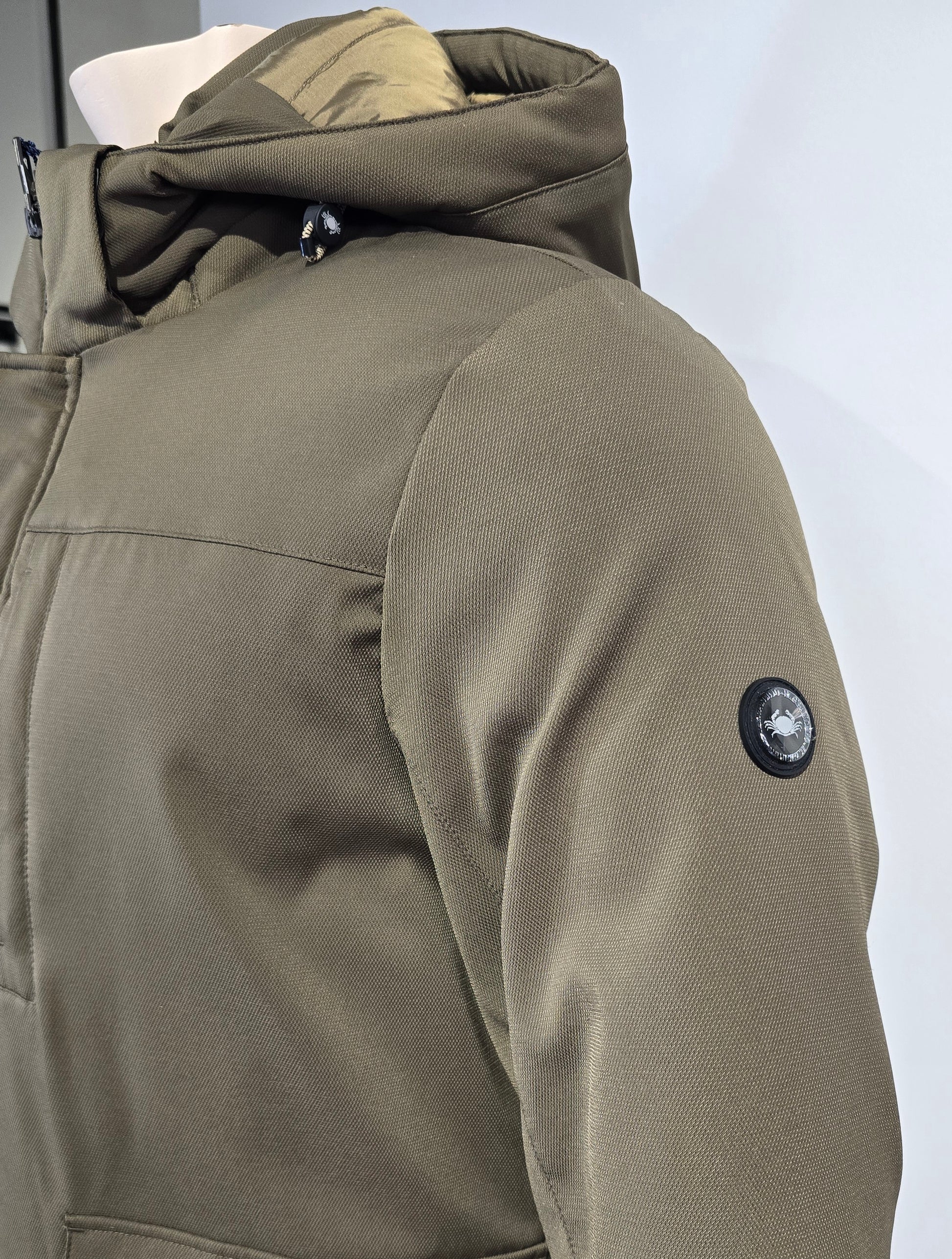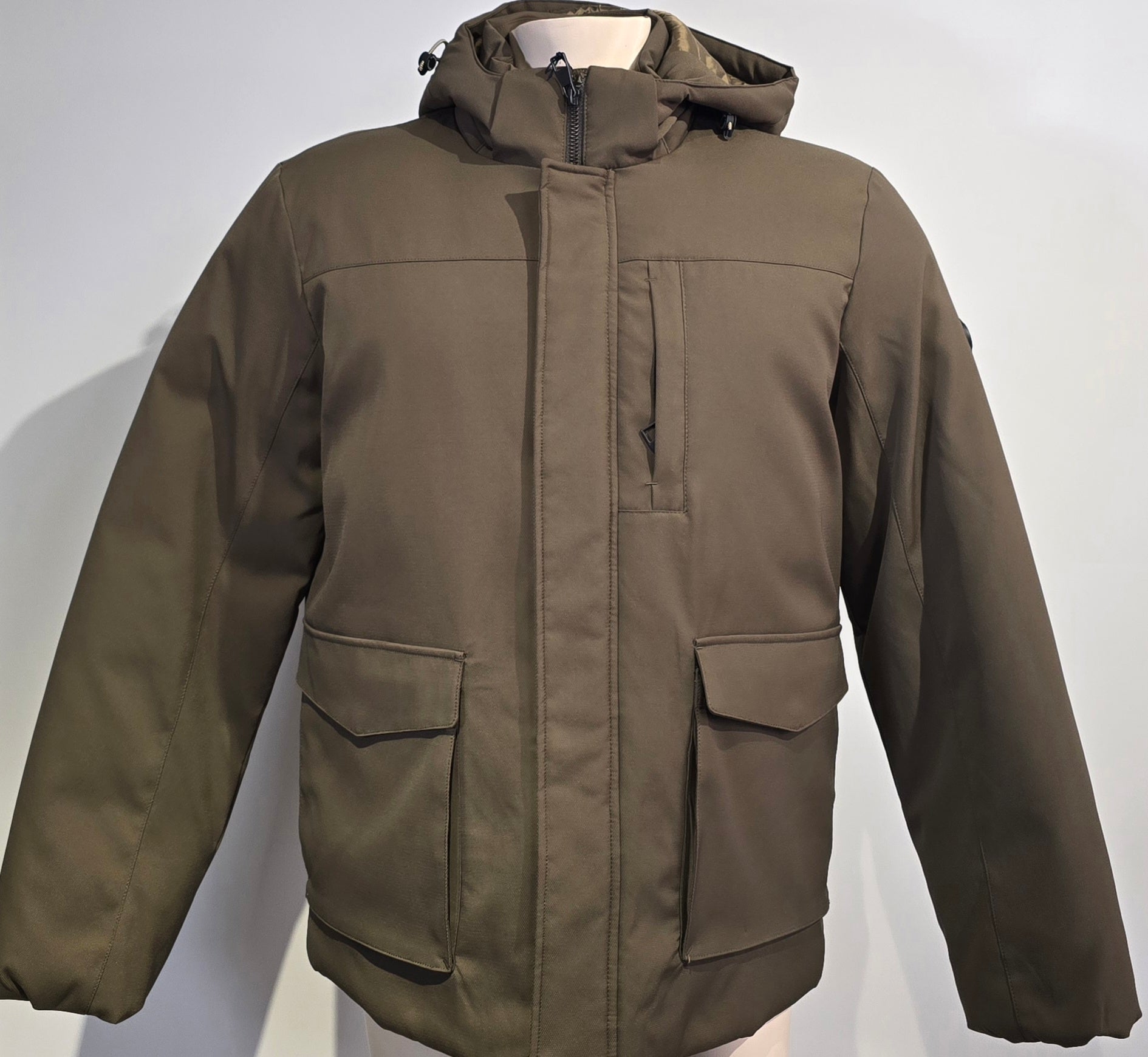 Giacca in tessuto tecnico idrorepellente, dal design pulito e funzionale. Presenta cappuccio regolabile, chiusura frontale con zip coperta e bottoni a pressione, tasche laterali con patta e una tasca verticale sul petto con zip. Interno imbottito termico per garantire comfort e calore nelle giornate fredde. Vestibilità regolare. Sia per il lavoro che per il tempo libero