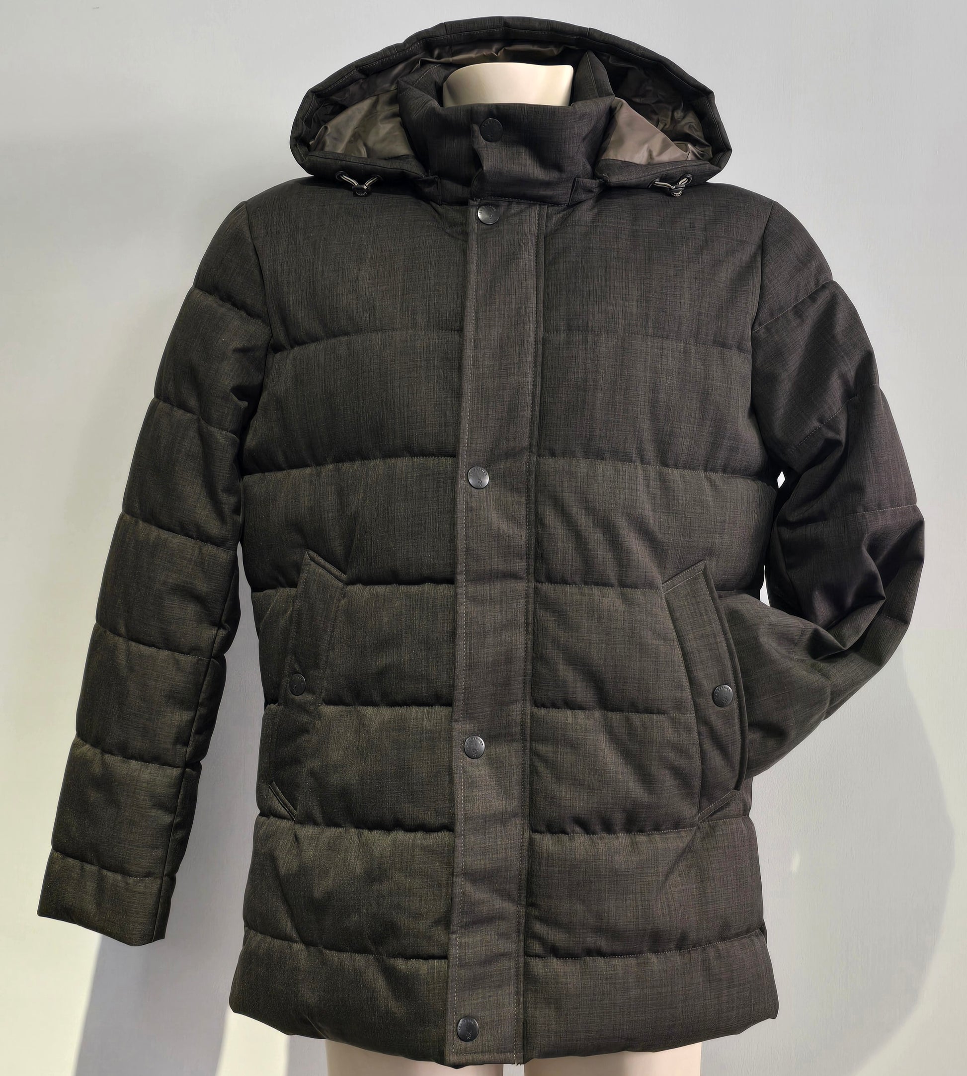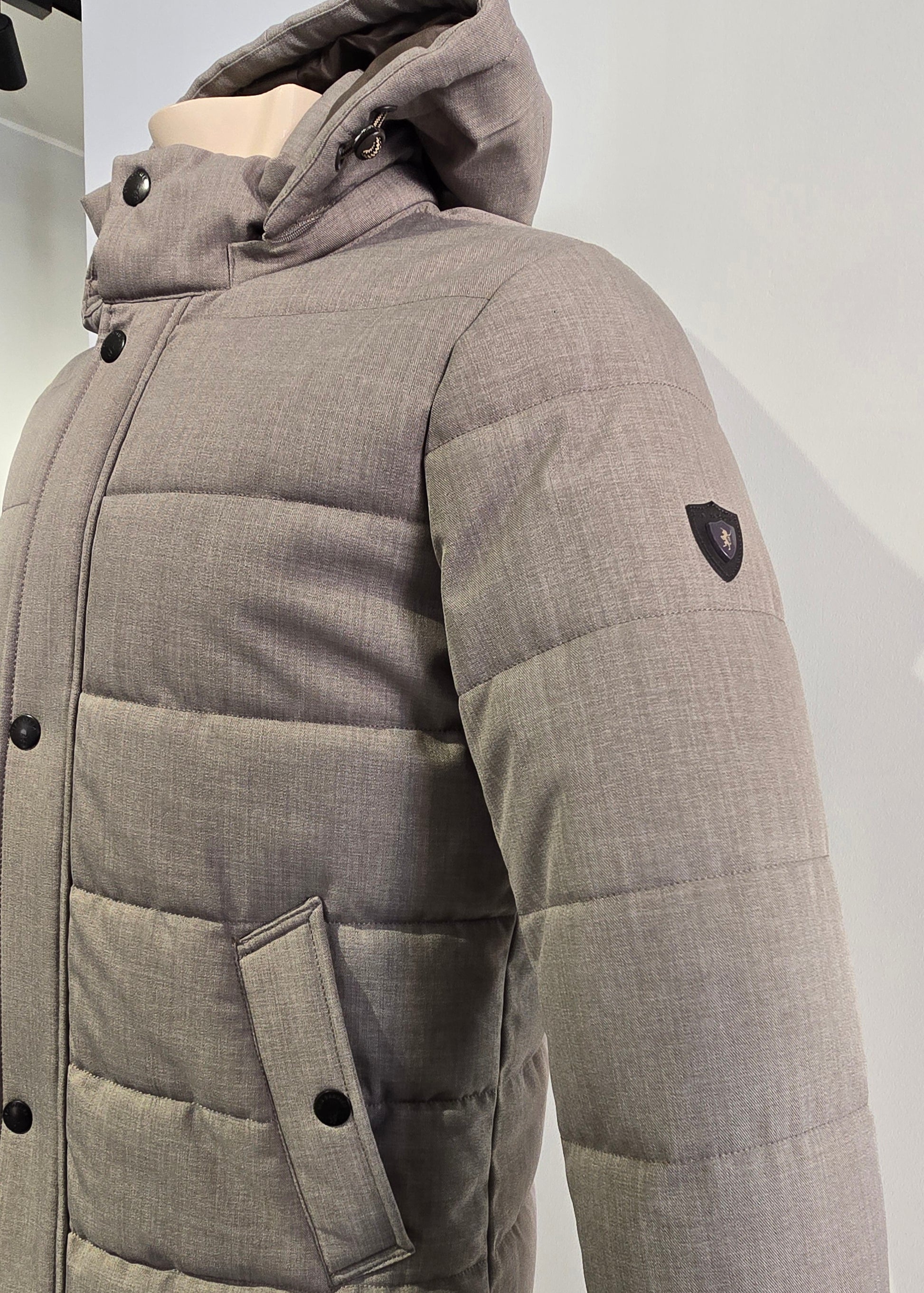 Giacca invernale imbottita con cappuccio removibile e chiusura frontale a zip coperta da patta con bottoni automatici. Il tessuto presenta una trama mélange dall’aspetto elegante e versatile, ideale sia per look casual che più raffinati.