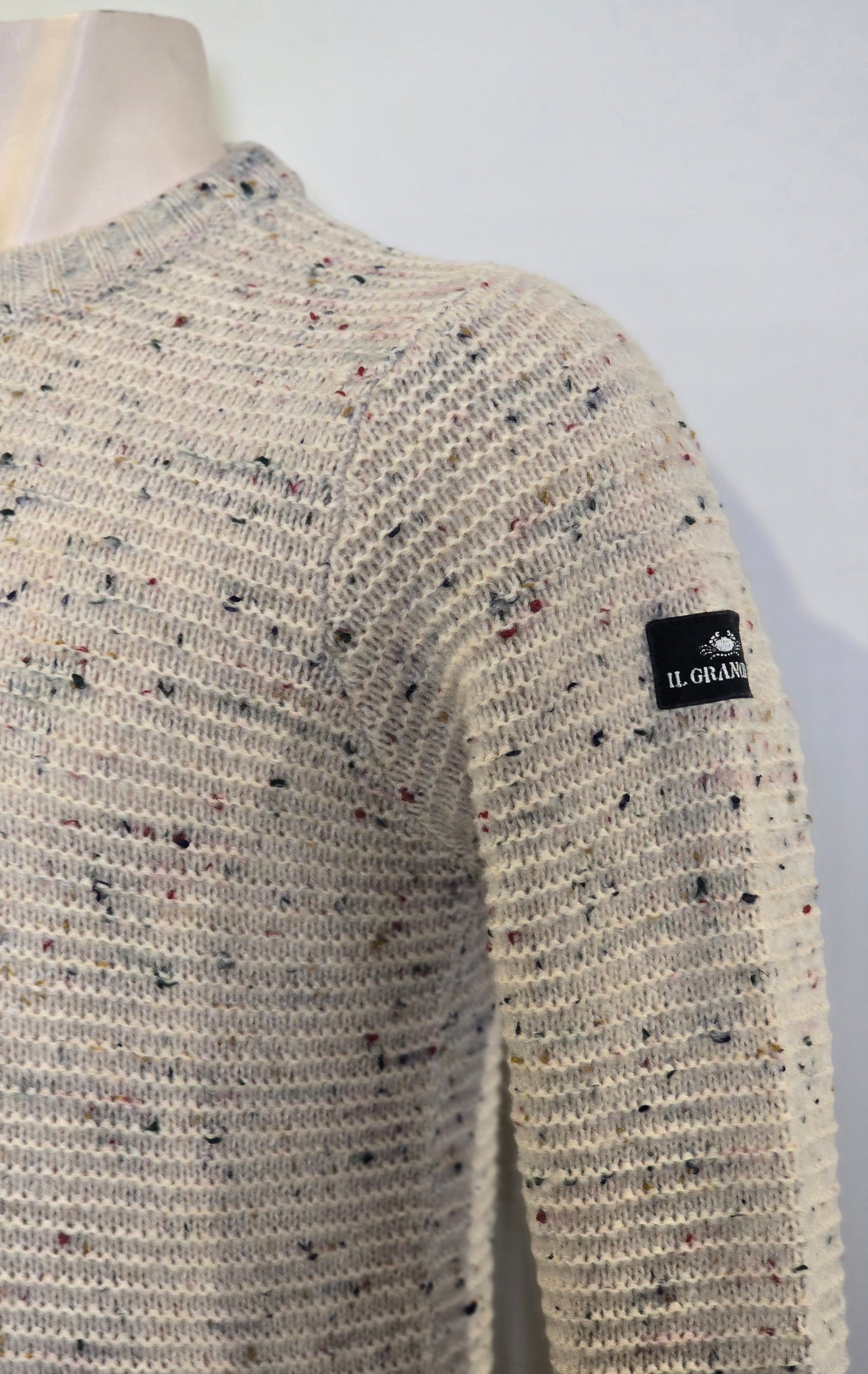 Questo maglione Il Granchio è realizzato in morbido filato mélange con effetto “fiammato”, caratterizzato da piccole puntinature di colore che rendono ogni pezzo leggermente diverso e originale.