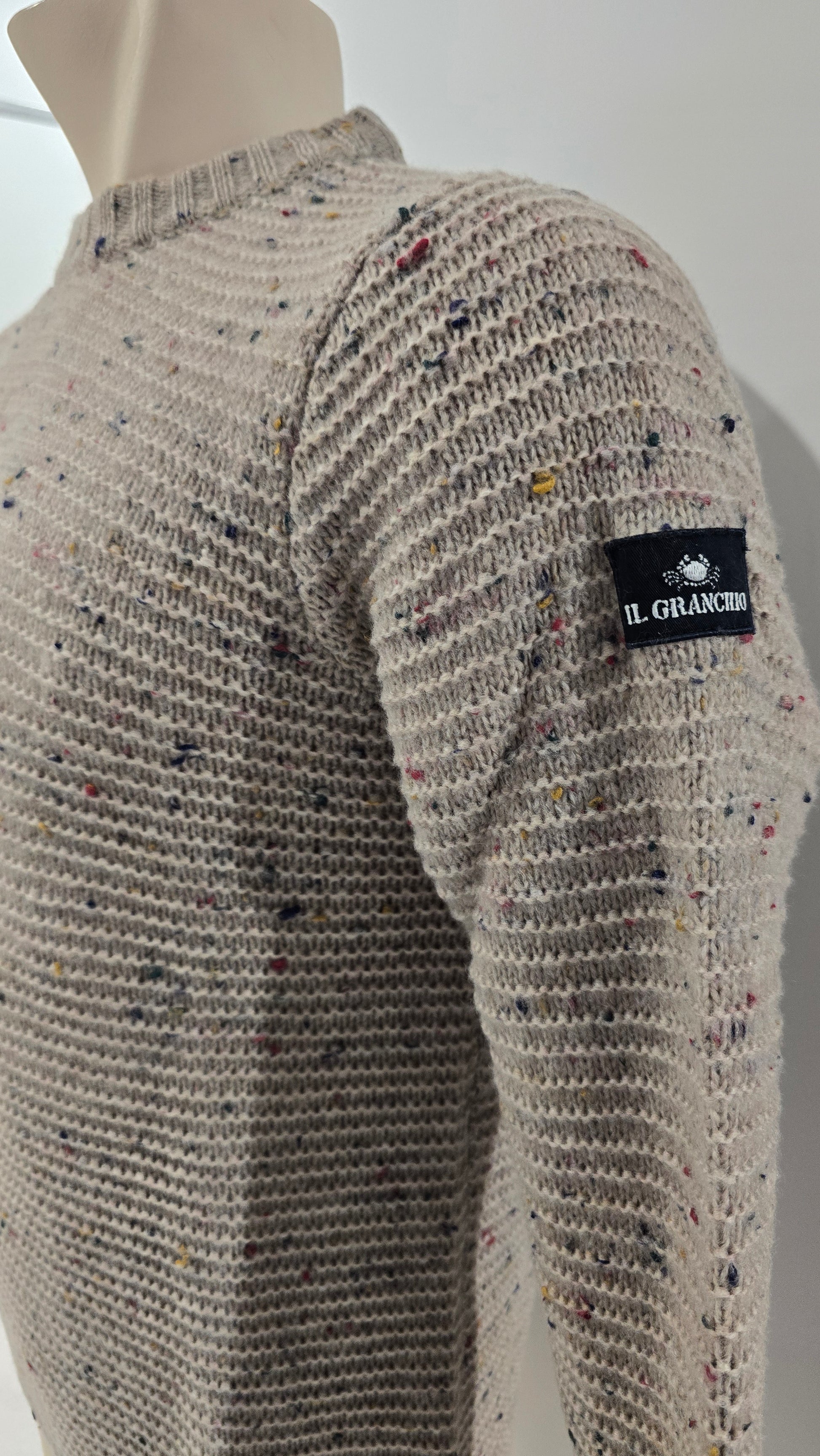 Questo maglione Il Granchio è realizzato in morbido filato mélange con effetto “fiammato”, caratterizzato da piccole puntinature di colore che rendono ogni pezzo leggermente diverso e originale.