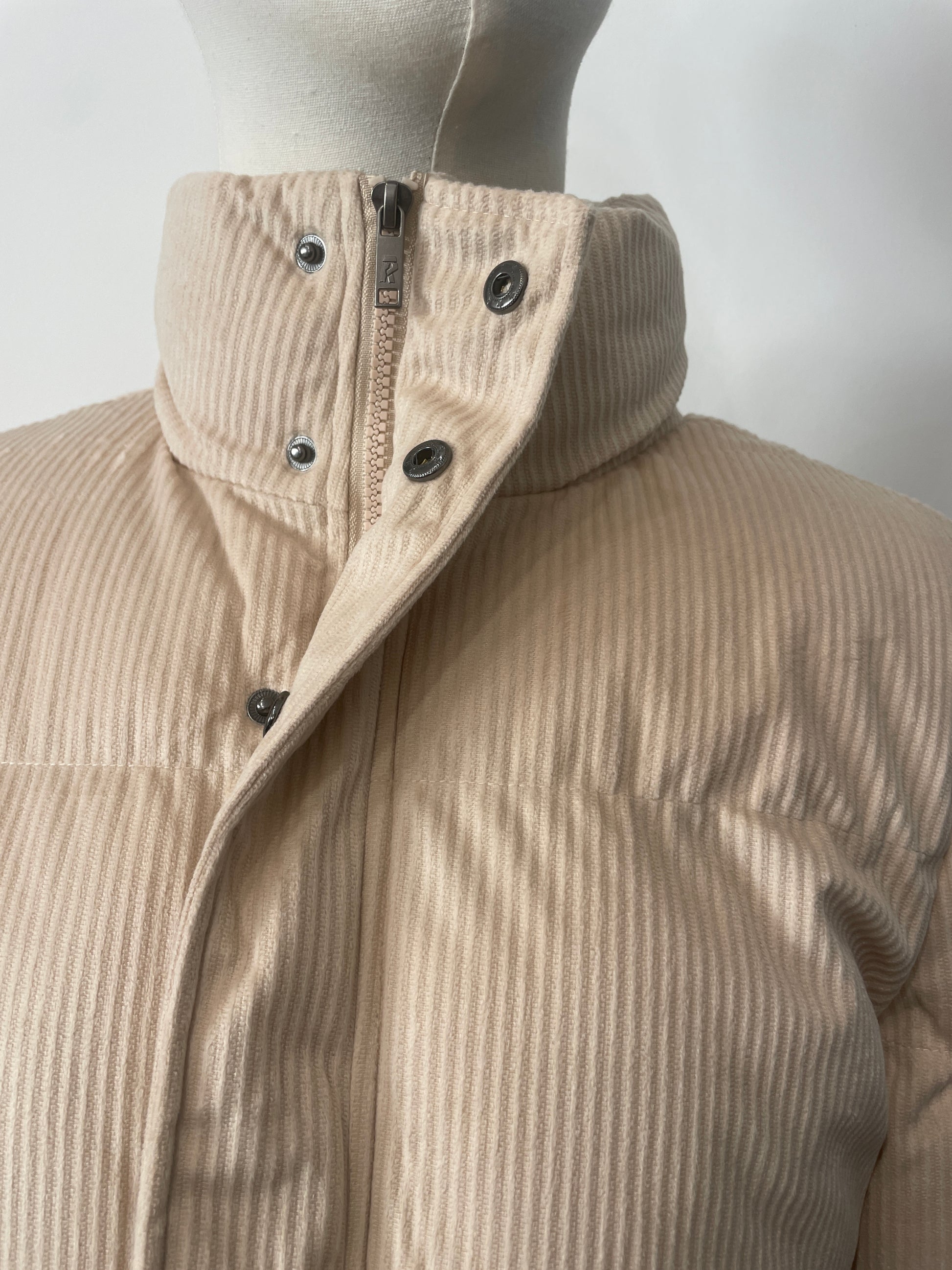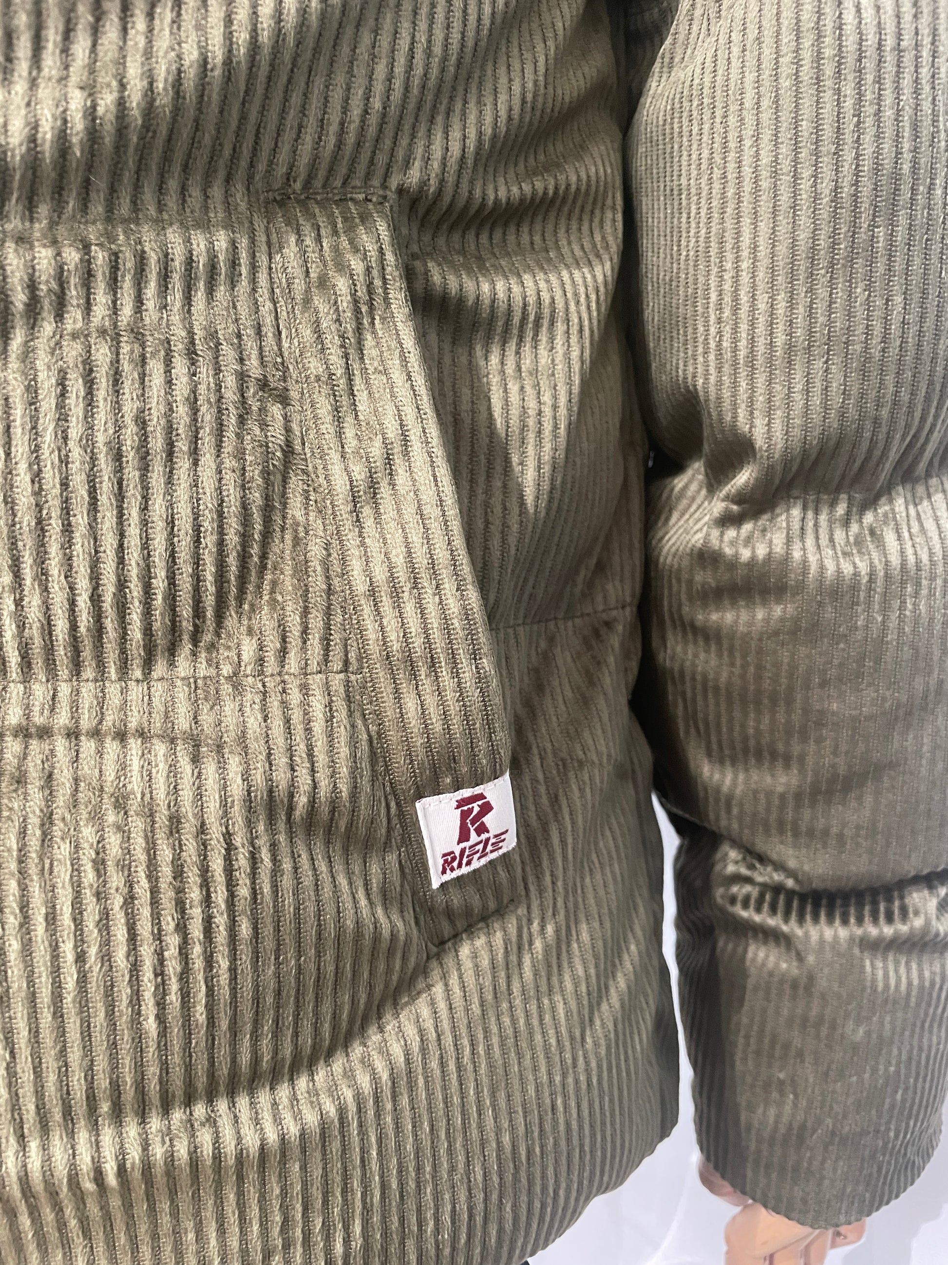 Questo piumino RIFLE da donna è realizzato in velluto a coste effetto soft touch, un materiale che unisce comfort e stile in perfetto equilibrio.